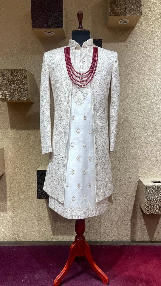 Description: The Cream Layered Silk Sherwani with Threadwork and Rhinestone Embellishment is a luxurious and elegant attire, perfect for making a grand statement at any special occasion. This sherwani features intricate threadwork combined with sparkling rhinestone embellishments, adding a touch of glamour and sophistication.