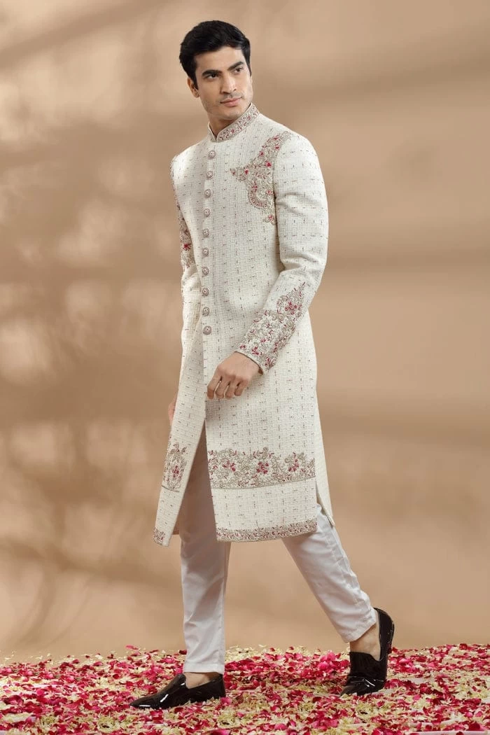 Hand Embroidered Sherwani with Placement Embroidery in Resham, Zardosi, and Kasab Work: