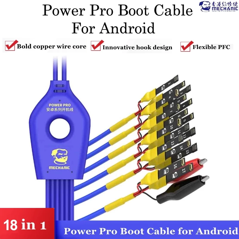 The Mechanic Power Pro 18 in 1 Power Booster Cable is a versatile and high-performance tool designed for technicians and repair professionals. This cable is essential for powering, testing, and diagnosing a wide range of mobile devices.