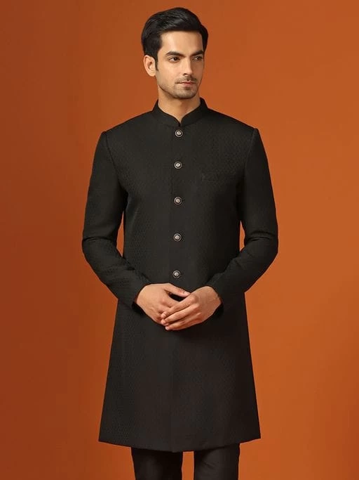 Description: The Men Black Sherwani with Front Closure is a sophisticated and elegant attire, perfect for making a bold statement at any special occasion. This sherwani features a sleek design with a front closure, adding a touch of modern elegance to its traditional style.