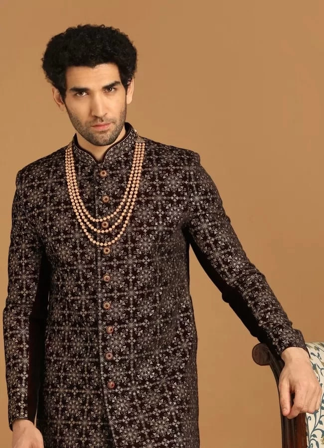 The Regal Velvet Maroon Sherwani Set is a luxurious and elegant choice for various formal occasions.