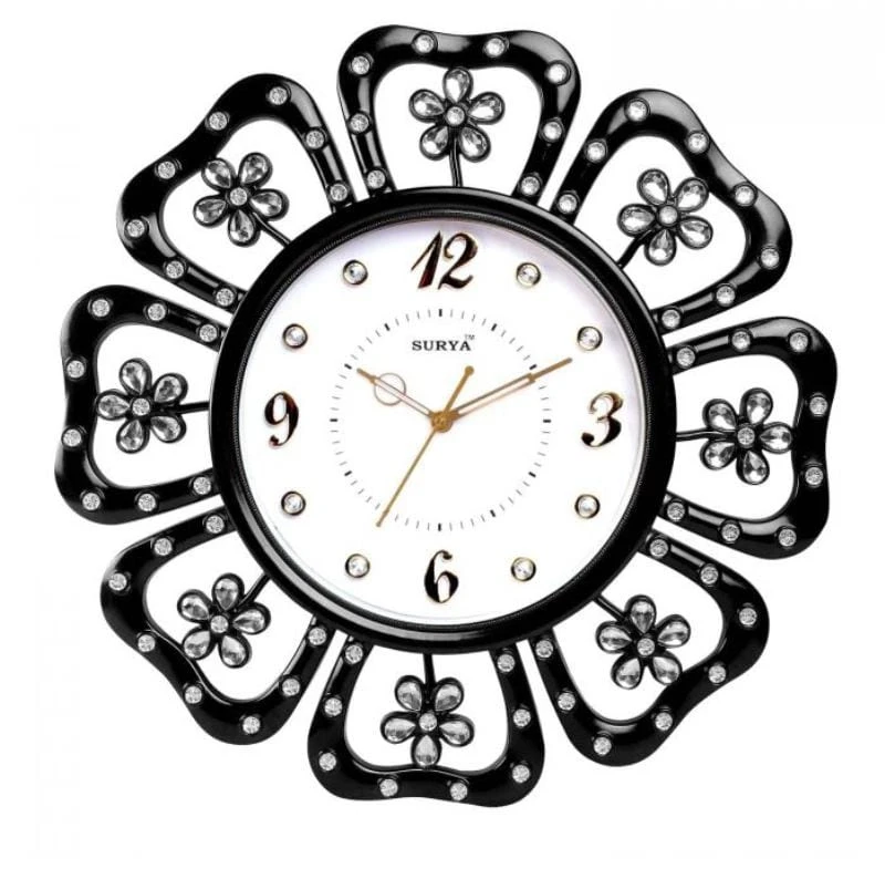Enhance your home décor with the Black Surya Clock, featuring a stunning flower design and elegant white diamond accents. This timepiece blends traditional aesthetics with modern craftsmanship, making it a unique and stylish addition to any space.