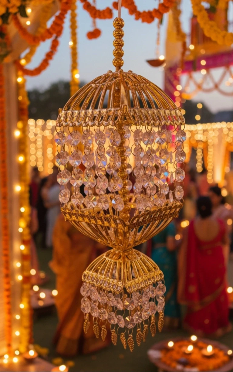 Crafted with meticulous attention to detail, the golden metal framework features traditional Indian decorative patterns and intricate wirework. The warm golden finish adds luxury and elegance while providing the structural foundation for the elaborate crystal arrangements on both tiers.