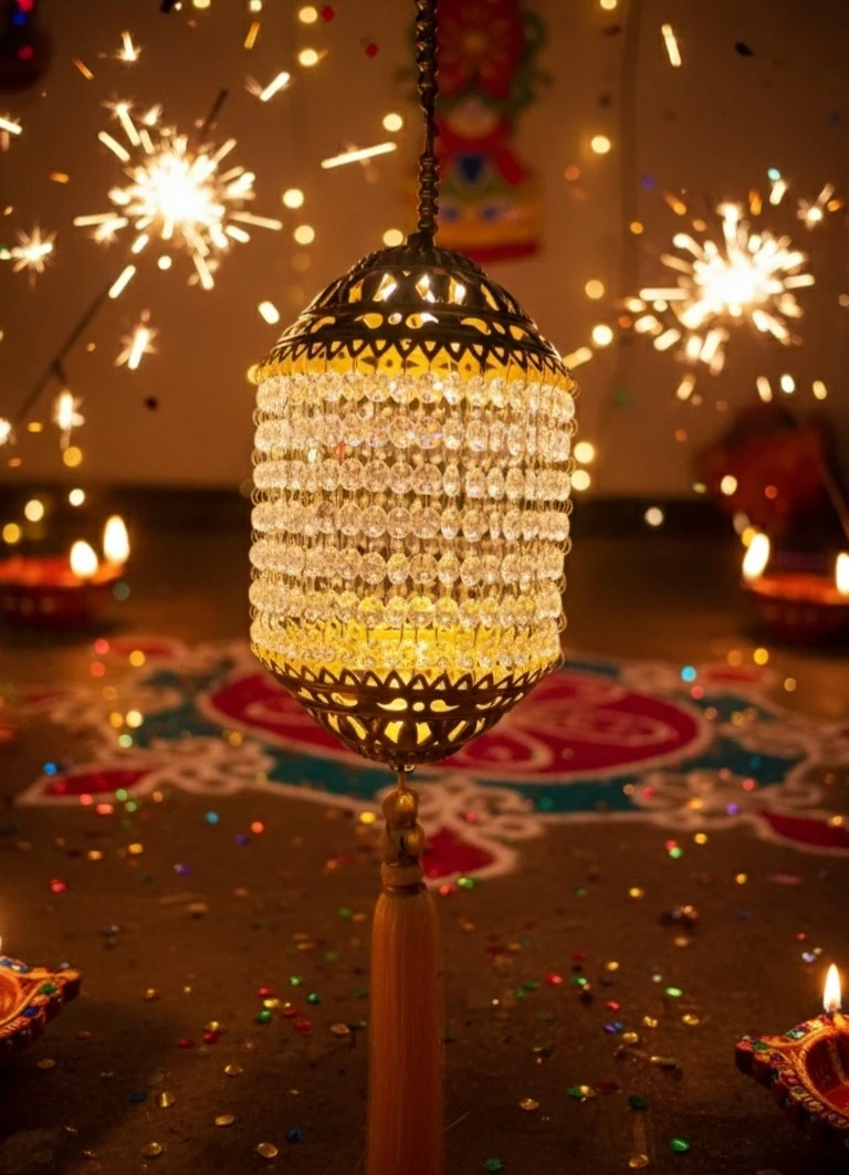Elevate your home décor with this stunning traditional 7 Nag Jumer pendant light featuring intricate metalwork and cascading crystal beads. This elegant hanging lantern combines classical Indian design elements with sparkling crystal embellishments to create a sophisticated lighting fixture that serves as both functional illumination and artistic centerpiece.